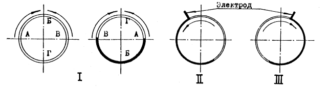 I, II, III - положение при сварке соответственно первого, второго и третьего слоев. Технология ручной электродуговой сварки поворотных стыков заключается в следующем. Первый слой накладывают на верхнюю полуокружность всех стыков секции. После этого секцию поворачивают на 180° и продолжают сварку первого слоя на второй полуокружности стыка, Второй слой накладывают в полувертикальном положении путем постепенного поворачивания трубы. Второй слой шва, так же как и первый, делают с вогнутой поверхностью валика. Третий слой накладывают аналогично второму, но трубу поворачивают в обратном направлении. Третий, последний слой должен иметь выпуклую равномерную поверхность с усилением 1 - 8 мм. Переход от наплавленного металла к основному делают плавным по всей длине шва. Перед наложением второго и третьего слоев, образовавшийся шлак пря сварке предыдущего слоя тщательно удаляют. Сварку поворотных стыков выполняют электродами УОНИ - 13/45 и УОНИ -13/55, а также Э-42 и Э-42А и другими толщиной 3 мм (первый слой), 4 мм (второй слой) и 5 мм (третий и последующие слои). Первый слой сваривают током величиной 120 - 160 а, для последующих слоев ток увеличивают до 220 - 240 а. ПОСЛЕДОВАТЕЛЬНОСТЬ ВЫПОЛНЕНИЯ ЭЛЕКТРОДУГОВОЙ РУЧНОЙ СВАРКИ НЕПОВОРОТНЫХ СТЫКОВ