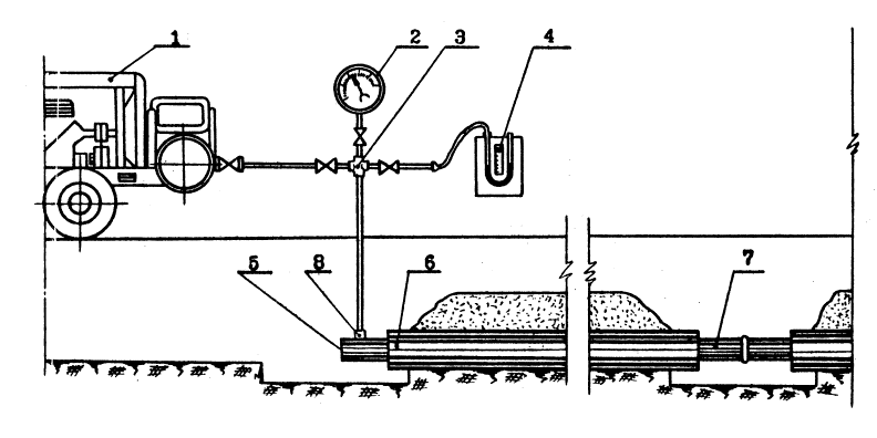 ЭКСПЛИКАЦИЯ: 1. Компрессор 5. Заглушка 2. Манометр пружинный 6. Битумоперлитовая изоляция 3. Арматура дпя испытаний 7. Трубопровод 4. U - образный ртутный манометр 8. Штуцер