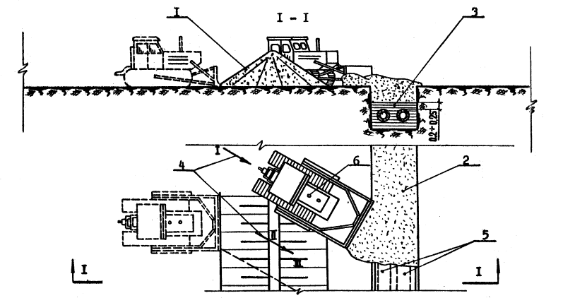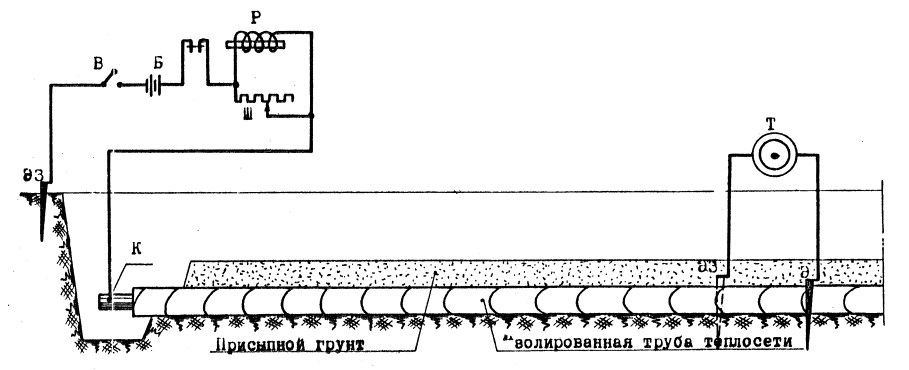 ОБОЗНАЧЕНИЕ: Б - батарея, В - выключатель, Р - реле-прерыватель, Т - телефонные наушники, Ш - шунт, Э - электрод-щуп, ЭЗ - заземленные электроды, К - контакт с трубой. После присыпки теплопроводов на 20 - 25 см нужно производить проверку на отсутствие непосредственного электрического контакта между металлом труб и землей прибором ИПИТ, один из проводников которого заземляют, а другой соединяют с трубой. Если после замыкания выключателя (В) в приборе раздается характерный треск, издаваемый реле-прерывателем, значит на проверяемом участке труб имеется повреждение битумоперлитной изоляции. В этом случае при помощи телефона, находят места повреждения, которое определяют по наибольшей силе шума в наушниках. ЗАСЫПКА ТЕПЛОВЫХ СЕТЕЙЗАСЫПКА ТЕПЛОСЕТЕЙ БУЛЬДОЗЕРОМ СXEМA ОРГАНИЗАЦИИ РАБОТ