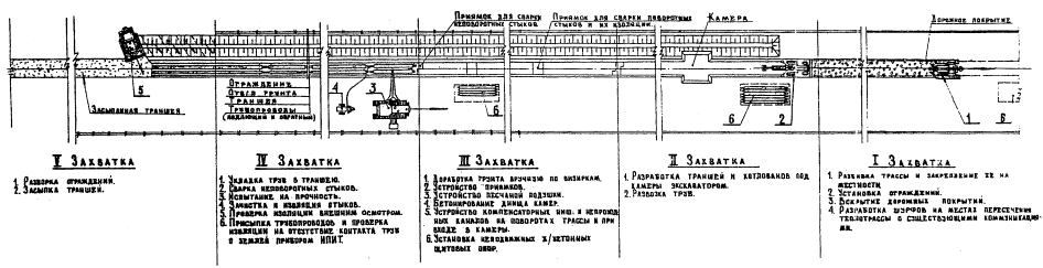 УКЛАДКА ТРУБУКАЗАНИЯ ПО ПРОИЗВОДСТВУ РАБОТ До начала укладки все трубы должны быть завезены на объект и разложены в две линии вдоль траншеи на расстоянии 1,5 м от бровки в том порядке, в каком они должны быть уложены в траншею. После раскладки труб должны быть устранены все повреждения изоляции. Трещины шириной до 10 мм должны заливаться горячим битумом марки БН-ТУ, отколы и др. разрушения изоляции заделываются горячей битумоперлитовой массой с последующей оклейкой поврежденных мест двумя слоями стеклоткани. Спуск труб с битумоперлитовой изоляцией в траншею производится трубоукладчиком, который должен быть снабжен траверсой с мягкими полотенцами или клещевым захватом конструкции треста "Киевподземстрой" № 1. Запрещается строповка труб тросом за изолированные участки. Укладка труб начинается после приготовления песчаной подушки, заготовки песка для подбивки труб и проверки соответствия отметок дна траншеи проекта. Опускание труб должно производиться плавно без рывков и ударов о дно и стенки траншеи. Категорически запрещается сбрасывание труб в траншею. Освобождение труб от захватных приспособлений следует производить после закрепления их подбивкой песком, выверки по уклону и прямолинейности и прихватки стыков сваркой. Не допускается укладка труб "змейкой" в вертикальной или горизонтальной плоскости. Отклонение трубопровода от проектного положения не должно превышать 10 мм. СХЕМА ОРГАНИЗАЦИИ РАБОТ ПО УКЛАДКЕ ТРУБ ТЕПЛОСЕТИ В ТРАНШЕЮ