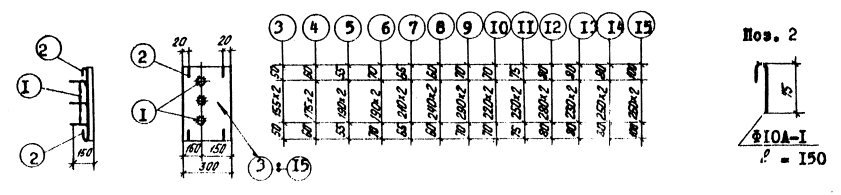 ПРИМЕЧАНИЕ. 1. B местах установки дет. 6, 8 стержни дет. 1 и 2 обрезаются по месту и привариваются к дет. 6, 8. 2. Перед установкой на место стержня сварить в пространственный каркас точечной электросваркой. СБОРНЫЕ ЖЕЛЕЗОБЕТОННЫЕ ЩИТОВЫЕ ОПОРЫ НО-2-1 ÷ НО-2-2 Геометрические размеры и арматура