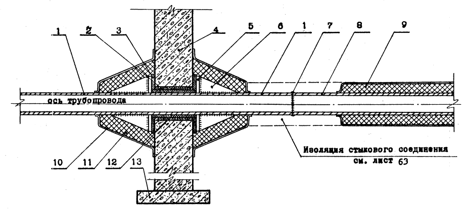 1 - патрубок (=1,5 м), 2 = паронитовый цилиндр, 3 - паронитовое кольцо, 4 - железобетонная плита, 5 - упорное стальное кольцо, 6 - стальная косынка, 7 - сварной стык, 8 - труба теплосети, 9 - битумоперлитовая изоляция (заводская), 10 - два слоя бризола (стеклоткани), 11 - битумоперлитовая изоляция, 12 - просмоленная пакля, 13 - бетонная подушка