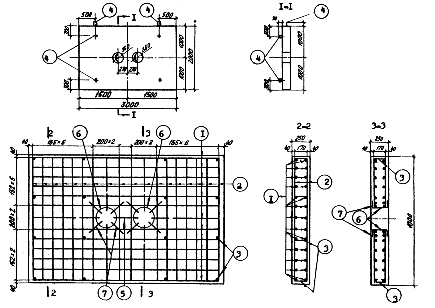 ПРИМЕЧАНИЕ, 1. В местах установки дет.3, 4 и стержни дет.1, 2 обрезаются по месту и приваривается к дет. 3, 4. 2, Перед установкой на место стержни сварить в пространственный каркас точечной электросваркой. МОНОЛИТНАЯ ЖЕЛЕЗОБЕТОННАЯ ЩИТОВАЯ ОПОРА НОМ-3-3. Геометрические размеры и арматура.