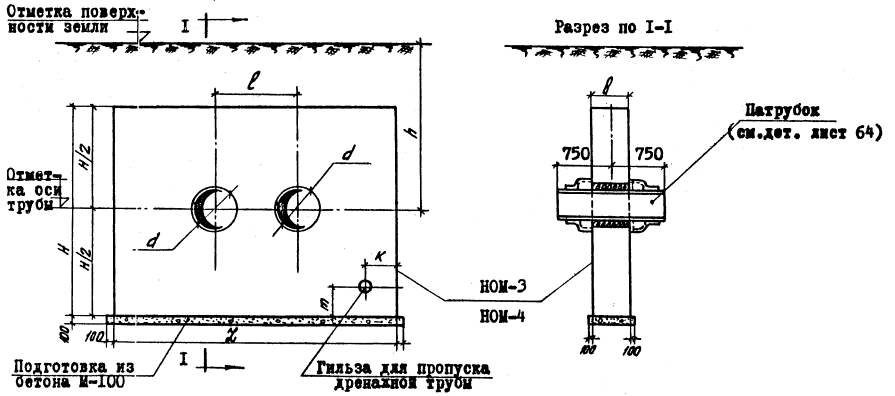 ПРИМЕЧАНИЕ Несущая способность неподвижных опор дана для сухих грунтов с объемным весом γ = 1,8 т/м3 и нормативным углом естественного откоса φн =30°. При других исходных данных несущая способность опоры должна быть пересчитана. 1. Неподвижные щитовые опоры труб Ду 50 ÷ 250 мм с патрубками изготавливаются в заводских условиях или на полигоне. Опоры для труб Ду 300 ÷ 500 мм выполняются на трассе. Расход материалов на одну щитовую опору для двухтрубной прокладки приведен на. листе 83. 2. При наличии попутного дренажа в щите заложить гильзу соответствующего диаметра для пропуска дренажной трубы. 3. Наружные поверхности опор обмазать горячим битумом марки БН-IV за два раза. 4. При агрессивности грунтовой воды по отношению к бетону выбирать плотность бетона, инертные для его приготовления и вид цемента стойкие к данному виду агрессии. 5. Траншею у опоры засыпать песчаным грунтом с тщательным послойным трамбованием.
