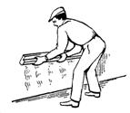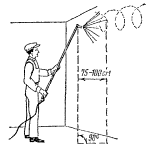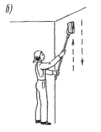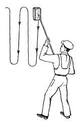 Маляр держит пистолет в правой руке. Левой удерживает ограничительный щиток на расстоянии 25 - 30 см от окрашиваемой поверхности, нажимает курок и перемешает пистолет сверху вниз (окраска вертикальными полосами). Каждая из последующих полос должна перекрывать предыдущую на 3 - 4 см. Пистолет должен всегда строго перпендикулярен к окрашиваемой поверхности |