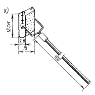 Технология и организация процесса (табл. 45). Маляр перед началом работы подготавливает приспособление-инструмент (рис. 45) и окрасочный состав (набирает его в ведро и подносит к месту работы) и начинает окраску труб, предварительно протерев их ветошью. На высоту 1,8 м окраска труб выполняется с пола при помощи приспособления; при высоте более 1,8 м - с инвентарного столика, который по мере выполнения работ передвигается маляром.