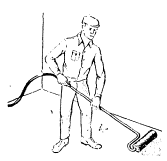 Маляр правой рукой держит пневмовалик за верхнюю рукоятку, придерживая указательным пальцем кран для подачи колера. Левой рукой поддерживает пневмовалик за нижнюю рукоятку |