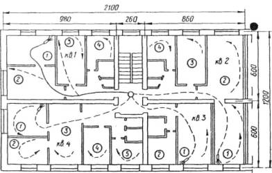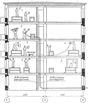 Рис. 2. Схема последовательности передвижения сопловщика при нанесении обрызга и грунта в пределах захватки: 1, 2, 3, 4, 5 - последовательность соплования по комнатам в квартире 5. Штукатурные работы выполняют поэтажно поточным способом с расчленением комплекса работ на следующие процессы (рис. 3): а) подготовка кирпичных и бетонных поверхностей с тщательной очисткой от пыли, грязи, жировых и битумных пятен, а также от выступивших на поверхности солей; б) механизированное нанесение слоев обрызга и грунта известковым раствором при помощи растворонасоса и бескомпрессорной форсунки; в) разравнивание слоев намета полутерком вручную; г) разделка лузг и усенков; д) накрывка и механизированная затирка поверхностей; е) отделка откосов. 6. При оштукатуривании швов между плитами перекрытия их предварительно очищают от пыли, смачивают водой. Затем швы заполняют цементным раствором и затирают. Для ускорения схватывания раствора добавляют 1-2 % гипса с тщательным перемешиванием смеси. После чего устанавливают направляющие рейки и прорезают русты. Рис. 3. Пооперационная технологическая схема: 1 - очистка и подготовка поверхностей; 2 - соплование с разравниванием; 3 - нанесение накрывочного слоя; 4 - затирка поверхностей; 5 - штукатурка откосов; 6 - заделка швов в железобетонных перекрытиях и устройство падуг 7. Оконные и дверные откосы штукатурят в следующей технологической последовательности: навешивают по отвесу рейки в соответствии с заданным углом рассвета по откосам, наносят раствор и разравнивают его. Затем по грунту наносят накрывочный слой, затирают терками, снимают рейки и производят разделку усенка с устройством фаски. 8. После настилки дощатых полов и заполнения дверных проемов плинтуса и наличники обмазывают раствором с заглаживанием поверхности. 9. Оштукатуривание кирпичных стен, сложенных в зимнее время способом замораживания, допускается только после оттаивания кладки со стороны штукатурного намета на глубину не менее половины толщины стены. Температура воздуха внутри здания должна быть не ниже +8°C (при измерении ее на высоте 0,5 м от пола). Влажность кирпичных стен, подлежащих оштукатуриванию в зимних условиях, не должна превышать 8 %. 10. Оконные отливы следует оштукатуривать до наступления холодов.
