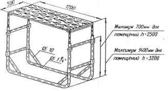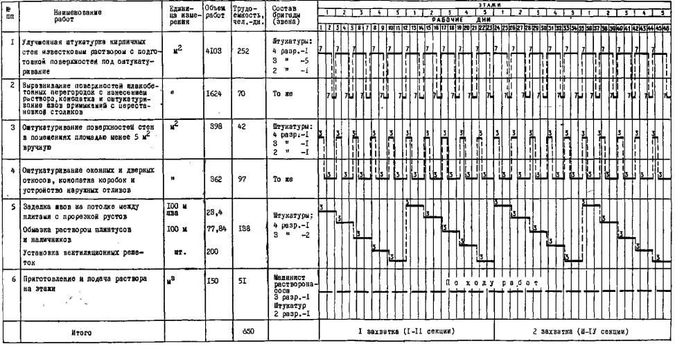 Рис. 4. Инвентарный двухвысотный переносной столик 11. Приготовление, транспортирование и хранение штукатурных растворов должно быть организовано так, чтобы доставленный на рабочее место раствор имел температуру в момент нанесения его на оштукатуриваемые поверхности не ниже +8°С. 12. Штукатурные работы выполняют с прочных инвентарных двухвысотных столиков со съемными щитами (рис. 4). 13. Рабочие, выполняющие штукатурные работы, должны соблюдать требования СНиП, часть III, раздел А, глава II «Техника безопасности в строительстве» (СНиП III-A.11-70). III. УКАЗАНИЯ ПО ОРГАНИЗАЦИИ ТРУДАВсе штукатурные работы выполняет бригада в составе 15 чел., состоящая из 4 звеньев. Штукатур 4 разр. является бригадиром. Он руководит работой бригады, следит за качеством выполняемых работ. 1 звено в составе семи штукатуров 4 разр. - 1, 3 разр. - 5, 2 разр. - 1. Штукатуры 3 разр. - 2 подготавливают поверхности стен под оштукатуривание. После нанесения и разравнивания раствора затирают поверхности стен затирочными машинками. Штукатур 4 разр. наносит обрызг и грунт на поверхность кирпичных стен соплованием. Штукатур 3 разр. двухметровым полутерком разравнивает слой грунта, выравнивает поверхность, срезая излишний намет. Штукатуры 3 разр. - 2 наносят на огрунтованную поверхность накрывочный слой вручную с последующим выравниванием полутерками и затирают лузги. Штукатур 2 разр. помогает штукатуру 4 разр. подносить шланг, поддерживает связь с мотористом при помощи электросигнализации и очищает раствор от перекрытия после соплования. Затем звено выравнивает поверхности шлакобетонных перегородок с нанесением раствора вручную и оштукатуривает места примыкания перегородок к стенам и перекрытию. 2 звено в составе трех штукатуров 4 разр. - 1, 3 разр. - 1, 2 разр. -1 оштукатуривает стены в помещениях площадью менее 5 м2, оконные и дверные откосы, конопатит коробки и устраивает наружные отливы. 3 звено в составе трех штукатуров 4 разр. - 1, 3 разр. - 2 заделывает швы на потолке между плитами с прорезкой рустов, обмазывает раствором плинтуса и наличники, устанавливает вентиляционные решетки. По окончании работ на первом этаже звенья переходят на второй этаж и т. д., где выполняют работы в том же порядке. 4 звено в составе машиниста растворонасоса 3 разр. и штукатура 2 разр. производит подачу раствора к рабочим местам штукатуров по мере надобности, а остальное время используется на других работах. IV. ГРАФИК ВЫПОЛНЕНИЯ ПРОИЗВОДСТВЕННОГО ПРОЦЕССА
