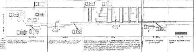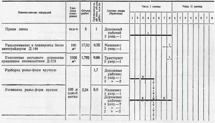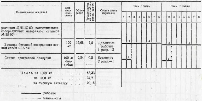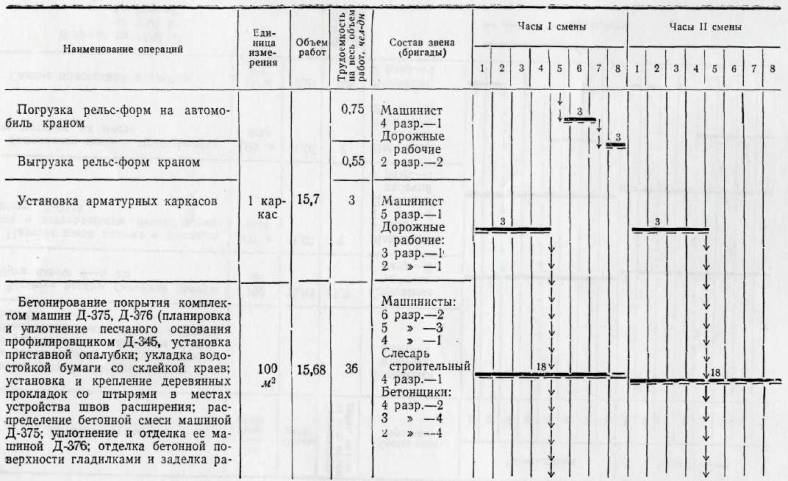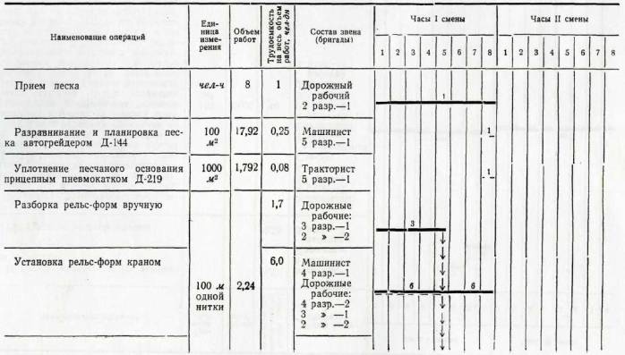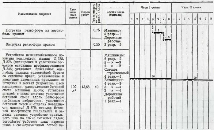 Планировка и уплотнение песчаного основания профилировщиком Д-345; уборка лишнего и подсыпка недостающего песка перед отвалом профилировщика; уборка песчаных валиков у рельс-форм после прохода профилировщика Д-345; установка приставной опалубки; разогревание битума; укладка водостойкой бумаги со склейкой краев; установка и крепление деревянных прокладок со штырями в местах устройства швов расширения; прием бетонной смеси с очисткой кузовов автомобилей от остатков смеси; распределение бетонной смеси машиной Д-375; установка штырей в швах сжатия; уплотнение бетонной смеси вдоль рельс-форм глубинным вибратором; уплотнение бетонной смеси и отделка поверхности машиной Д-376; откидка бетонной смеси от края лопастного вала машины Д-376 и очистка рельс-форм от смеси; отделка бетонной поверхности гладилками; удаление цементного молока с поверхности покрытия и заделка раковин; устройство продольного шва на стыке смежных рядов; устройство рабочего шва; нарезка швов в свежеуложенном бетоне нарезчиком ДНШС-60 (при устройстве цементнобетонного покрытия); нанесение пленкообразующих материалов машиной М-28-60.