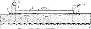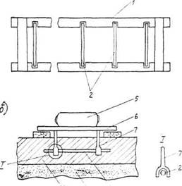 Один дорожный рабочий 3 разр. и один 2 разр. готовят основание под рельс-формы и устанавливают деревянные подкладки под стыки рельс-форм.