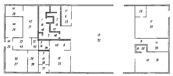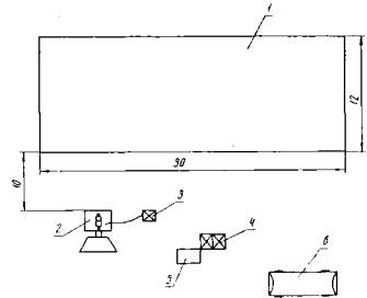 Рис. 1. Схема очередности выполнения работ звеньями по помещениям: 1-9-механизированная штукатурка звеном № 1; 10-27-обработка швов между плитами покрытия звеном № 1; 28-45-выравнивание поверхности стеновых панелей и перегородок звеном №2; 46-50-облицовка стен плиткой звеном № 3 Все штукатурные работы должны быть выполнены в соответствии со СНиП III-В.13-62, пп. 2.38-2.40. Отклонения облицовываемых поверхностей от вертикали не должны превышать указанные в табл. 5 СНиП III-B.4-62, пп. 7, 8. Поверхности облицовываются в соответствии со СНиП III-В.13-62, пп. 8.53-8.54. Техника безопасностиРабочие, занятые на механизированной штукатурке и затирке, должны быть обеспечены соответствующей спецодеждой и индивидуальными средствами защиты от брызг, раствора (защитными очками, резиновыми перчатками, комбинезонами). Облицовщики должны быть обеспечены резиновыми перчатками. Все работы по объекту должны выполняться в соответствии с требованиями; СНиП III-А.11-70. Техника безопасности в строительстве, главы 1, 2, 4, 8, 17. Лица, работающие с электрифицированными инструментами, должны быть специально обучены и иметь первую квалификационную группу по электробезопасности. III. УКАЗАНИЯ ПО ОРГАНИЗАЦИИ ТРУДАСхемы организации работ и рабочих мест показаны на рис. 2, 3, 4. Работы выполняет бригада из 11 чел. в составе 3 звеньев. Первое звено: 6 штукатуров (4 разр.-2; 3 разр.-2; 2 разр.-2), штукатур 4 разр. является бригадиром. Второе звено: 2 штукатура (4 разр.- 1; 2 разр.- 1). Третье звено: 3 облицовщика-плиточника (4 разр.- 1; 3 разр.-l; 2 разр.-1). Первое звено заделывает места прохода санитарно-технических труб и места установки электрооборудования, штукатурит кирпичные перегородки и стены, стойки входов, вентиляционные шахты и обрабатывает швы между плитами. Второе звено выравнивает поверхности панельных стен и гипсолитовых перегородок, штукатурит цоколь, парапет и откосы, подмазывает наличники и плинтуса. Третье звено облицовывает глазурованной плиткой стены санитарных узлов и заготовочную. В первом звене штукатур 4 разр. наносит раствор растворонасосом при штукатурке кирпичных поверхностей, разравнивает нанесенные растворонасосом слои штукатурки с отделкой лузг и усенков, обрабатывает швы между плитами покрытия, заделывает места прохода санитарно-технических труб и штукатурит стойки входов; штукатур 3 разр. разравнивает слои раствора при механизированном их нанесении с отделкой лузг и усенков, затирает накрывочный слой машинкой СО-55, заделывает места прохода санитарно-технических труб и штукатурит вентиляционные шахты; штукатур 2 разр. заделывает места прохода санитарно-технических труб, обслуживает растворонасос при механизированной штукатурке и подаче раствора на рабочее место, со штукатуром 4 разр. участвует в нанесении раствора, подготовляет поверхности под оштукатуривание (смачивает, очищает, срубает наплывы раствора и т. д.). Рис. 2. Схема организации штукатурных работ по вокзалу на 100 пассажиров (размеры указаны в метрах): 1-вокзал на 100 пассажиров; 2-приобъектная растворная станция; 3-резервуар для воды; 4-бункер для хранения цемента, гипса; 5- контейнер для хранения штучных материалов; 6- передвижное бытовое помещение Во втором звене штукатур 4 разр. выравнивает поверхности стеновых панелей и гипсолитовых перегородок с затиркой машинкой СО-55, штукатурит оконные и дверные откосы, цоколь, парапе