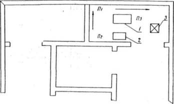 Рис. 4. Организация рабочего места при облицовке плиткой: 1-ящик для раствора; 2-столик-верстак для обработки плиток; 3-контейнер КП-93; П1-П3-облицовщики 3 разр. сортирует, прирезает и сверлит плитки и с облицовщиком 4 разр. устанавливает рядовые плитки; облицовщик 2 разр. приготовляет и транспортирует раствор на рабочее место, подготовляет поверхности под облицовку (наносит борозды, увлажняет поверхности), заполняет и очищает швы облицованной поверхности. Описание основных технологических процессов1. Механизированная штукатурка кирпичных перегородок До набрызга слоя раствора помещение очищается от строительного мусора и пыли, удаляются наплывы раствора, в помещении создается температура не ниже +8°, обеспечивается звуковая или световая сигнализация с рабочим, обслуживающим растворонасос (штукатур 2 разр., входящий в состав первого звена). Очищенные поверхности стен смачиваются водой, подаваемой из растворонасоса. Через 15-20 мин на поверхность стен набрызгивается слой цементно-известкового раствора. Эти операции выполняют штукатур 4 разр. и штукатур 2 разр. Штукатур 2 разр. подносит