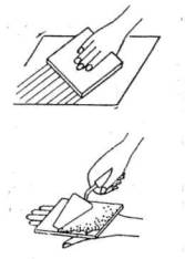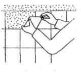 3. Затирка поверхностей машинкой Штукатур приставляет затирочную машинку вращающимися дисками к обрабатываемой поверхности и, легко перемещая ее в горизонтальном и вертикальном направлениях, затирает выравнивающий слой до ликвидации царапин, раковин и других неровностей. В процессе затирки поверхность смачивают водой. Подачу воды регулируют клапаном, укрепленным на рукояти затирочной машинки. Места, недоступные для механизированной затирки, затирают вручную теркой, в том числе лузги и усенки, а поверхность увлажняют кистью. 4. Заполнение шва раствором и натирка шва Штукатур с сокола кельмой