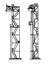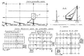 1 - кран; 2 - кассеты для панелей; 3- оттяжки; 4 - стропы; 5 - панели; 6 - смонтированные покрытия; 7 - стропильные фермы; 8 - стены; 9 - колонны; 10 - гидроподъемники МОНТАЖ ПЕРЕГОРОДОКРазработаны схемы монтажа перегородок из сборных железобетонных панелей одноэтажных промышленных зданий высотой до низа стропильных ферм покрытия от 3 до 18 м. Панели перегородок устанавливают после монтажа несущих и ограждающих конструкций здания, так как допускаемые ветровые нагрузки на них невелики. Толщина панелей перегородок - 80 мм. Рассмотрен монтаж продольных и поперечных перегородок высотой от 1,8 до 16,8 м (на 12 м ниже низа стропильных конструкций). Верхнюю честь перегородок, выполненную в виде легкого стального каркаса, обшитого асбестоцементными листами, крепят к закладным деталям колонн или к конструкциям покрытия. Панели продольных и поперечных перегородок устанавливают при помощи автомобильных или пневмоколесных кранов и траверсы высотой 0,8 м для работы в стесненных условиях. Выгрузка панелей перегородок из транспортных средств в кассеты предусмотрена автомобильным краном. Для установки панелей перегородок в стесненных условиях используют автомобильные краны с обычными стрелами различной длины, автомобильные краны с гидроприводом и телескопической стрелой на жесткой подвеске, а также пневмоколесные краны с телескопическим башенно-стреловым оборудованием. Наличие на кране телескопической стрелы позволяет плавно изменять ее длину при стесненных условиях работы, например, когда верхняя часть стрелы находится в междуферменном пространстве. С помощью крана K-161 можно монтировать перегородки в зданиях высотой до низа ферм от 6 до 15,6 м. Рабочим местом монтажников при устройстве перегородок и заделке стыков служат два монтажных подъемника, размещаемые у концов панели. Монтаж панелей ведут снизу вверх. Это позволяет быстрее начать отделочные работы. Раствор для заделки стыка наносят на верхнюю грань панели непосредственно перед ее установкой. Вместо монтажных подъемников можно применять подъемную люльку, рассчитанную на подъем двух рабочих, материалов (раствора с тарой) и инструментов общей массой до 200 кг. Стальными канатами люльку подвешивают между колоннами к опорному узлу фермы. Геодезический контроль и обеспечение точности монтажа перегородок Доставленные на строительную площадку панели перегородок следует проверить. Точность их размеров определяют стальной компарированной рулеткой. Погрешность контрольных измерений не должна превышать 10 % допускаемого отклонения по контролируемому параметру. При устройстве перегородок следует контролировать: положение осей или граней панелей в нижнем сечении относительно разбивочных осей на нижеустановленных конструкциях; отклонение от вертикали плоскостей этих панелей в верхнем сечении; разность отметок верха панелей каждого яруса в пределах выверяемого участка. Положение осей панелей относительно разбивочных осей проверяется двумя промерами от оси до грани панели. При проверке методом бокового нивелирования рейку следует поочередно прикладывать к нижней части грани панели и к верхней. Отклонение плоскостей панелей от вертикали контролируется с помощью отвеса-рейки или методом бокового нивелирования. Отметку верха перегородок проверяют методом геометрического нивелирован