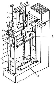 Устройство для выверки подкрановых балок Устройство для выверки подкрановых балок длиной 6 м состоит из жесткой рамы с направляющими и двух стоек. В направляющих рамы передвигается плита, на которой установлен гидравлический домкрат. К штоку домкрата прикреплена верхняя траверса, соединенная посредством тяг с нижней траверсой. К последней подвешены два крюка с канатами. Рама изготовлена из стального проката. С боков к ней прикреплены кронштейны для подъема и опускания роликов. В кронштейне со стороны стыковки с рамой имеется паз, куда вставляют линейку для вертикальной выверки балки. К передней части рамы прикреплен подшипник со штурвалом и гайкой. Через штурвал проходит винт, жестко соединенный одним концом с плитой. При вращении штурвала винт перемещается вдоль рамы, передвигая плиту по направляющим. С противоположной стороны к раме приварен упор из угловой стали, с помощью которого рама цепью крепится к колонне. В комплект устройства входят три пары сменных стоек. В зависимости от высоты балки (680; 850 и 1050 мм) используют стойки высотой соответственно 955, 1125 и 1325 мм. Выверку подкрановых балок с помощью устройства выполняют два монтажника. Сначала устройство монтажным краном устанавливают на торец подкрановой балки. Перемещают устройство вдоль балки на роликах вручную при помощи веревки. Для выверки балки устройство устанавливают на консоль колонны и закрепляют страховочной цепью. Верхний пояс балки захватывается клещевыми крюками устройства. Смещение балки по высоте и в плане производится при помощи домкрата и горизонтального винта. По окончании выверки под балку укладывают подкладки и закрепляют ее анкерными болтами. Далее траверсу опускают, выводят крюки из зацепления, устройство поднимают и на роликах перекатывают по балке к следующей колонне.