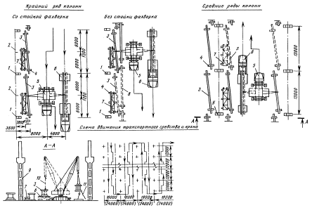 Схема монтажа подкрановых балок пролетом 12 м отдельными элементами по колоннам крайнего ряда со стойками фахверка