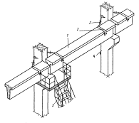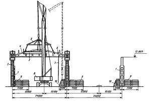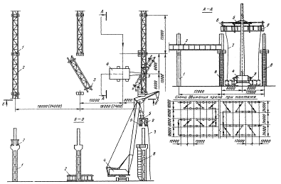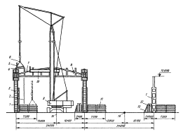 1 - колонна среднего ряда; 2 - укрупненный блок; 3 - деревянная подкладка; 4 - монтажный кран; 5 - траверса; 6 - стойка со страховочным канатом; 7 - оттяжка; 8 - приставные лестницы; 9 - монтажные лестницы МОНТАЖ ЖЕЛЕЗОБЕТОННЫХ ПОДКРАНОВЫХ БАЛОКТехнологическая схема разработана на монтаж железобетонных подкрановых балок длиной 6 и 12 м марок БКНБ6-3с массой 4,2 т и БКНБ12 массой 11,6 т (серия К-Э-01-50, выпуски 1-4). В состав работ, рассматриваемых схемой, входят: установка подкрановых балок и электросварка стыков. Организация и технология строительного процесса До начала монтажа подкрановых балок должны быть выполнены работы по: подготовке и планировке площадки, включая планировку мест раскладки подкрановых балок перед подъемом; устройству проездов для передвижения кранов; подводке силовой и осветительной сети; устройству временных помещений, необходимых для ведения монтажных работ; монтажу, выверке и закреплению по проекту колонн и вертикальных связей по ним; доставке к месту работ необходимого оборудования, инструмента, вспомогательных материалов и грузозахватных приспособлений. При монтаже железобетонных подкрановых балок следует руководствоваться требованиями главы СНиПа III-16-80 "Бетонные и железобетонные конструкции сборные". Перед установкой железобетонных подкрановых балок необходимо произвести геодезическую проверку правильности положения колонн в соответствии с допусками, также приведенными в главе СНиПа III-16-80. При перевозке и складировании подкрановые балки должны находиться в проектном положении. При этом опоры балок следует располагать в пределах опорных закладных элементов. В зону разгрузки подкрановые балки доставляют балковозами типа УПЛ-12. Монтаж подкрановых балок выполняется при помощи гусеничного крана РДК-25 и траверс грузоподъемностью 5 и 12 т. Перед подъемом балки необходимо установить на колонны монтажные лестницы, очистить монтажные узлы от грязи и мусора, закрепить на балке оттяжки из пенькового каната и застропить ее. Балку поднимают выше проектной отметки на 30-50 см, а затем с помощью оттяжек приводят ее в положение, близкое к проектному. При установке подкрановых балок риски на нижних торцевых гранях балок должны совпадать с рисками на консолях колонн. Временное крепление балки осуществляется с помощью болтового устройства или струбцины конструкции ЦНИИОМТП. В схеме представлена технология монтажа подкрановых балок с применением новых узлов сопряжения балок с колоннами. Новые узлы сопряжения предложены ЦНИИпромзданий совместно с ЦНИИОМТП и трестом Промтехмонтаж ЛатвССР. Новизна их заключается в том, что опорный лист и анкерные болты отсутствуют, а выверка балок производится с помощью устройства конструкции ЦНИИОМТП. После укладки балок на консоли колонн и временного крепления струбцинами или гибким вертикальным листом положение подкрановых балок выверяют по высотным отметкам, а положение продольной оси отвесом, навешенным на осевую проволоку (струну). Струна закрепляется на кронштейнах, установленных на крайних колоннах ряда на расстоянии 750 мм от оси ряда. Риски положения оси колонн выносятся при помощи теодолита. Выверка балок в плане и по высоте производится при помощи приспособления ЦНИИОМТП, которое передвигают по ряду балок. Выверку другого ряда балок в проекте наполняют таким же образ