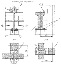 1 - колонна; 2 - закладные детали колонны; 3 - подкрановая балка; 4 - опорные листы; 5 - гайки с анкерными болтами (поставляются вместе с колонной) Примечания: 1. Монтажные швы приняты высотой 10 мм, выполняются после окончательной выверки балок и подкрановых путей. 2. Опорные листы поставляют с подкрановыми балками и приваривают к закладным деталям балок до установки их на место.