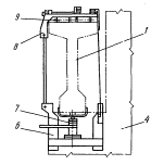 1 - плиты чердачного перекрытия; 2 - балки чердачного перекрытия; 3 - траверса; 4 - плиты покрытия; 5 - стропильные фермы; 6 - колонны; 7 - монтажный кран; 8 - подмости выдвижные катучие; 9 - оттяжка ЗАДЕЛКА СТЫКОВ И ШВОВ СБОРНЫХ ЖЕЛЕЗОБЕТОННЫХ КОНСТРУКЦИЙЗамоноличивание стыков колонн с фундаментами растворными (бетонными) смесями Подача растворной (бетонной) смеси в стыки колонн с фундаментами производится с помощью установки для приема и подачи жестких растворов (УПТЖР) конструкции Управления механизации отделочных работ Главмосстроя. Установка выполнена в виде утепленного фургона, в котором размещены пневмонагнетатель С-862, бункер для приема раствора, электропривод для перемешивания и загрузки раствора в пневмонагнетатель. Обеспечение установки сжатым воздухом предусматривается от передвижной компрессорной станции производительностью 5-6 м3/мин. Установку и компрессорную станцию располагают на объекте, исходя из возможной дальности подачи растворной (бетонной) смеси по горизонтали до 70-80 м (подвижность смеси 6-8 см). Затраты труда и время работы машины при замоноличивании колонн в фундаментах