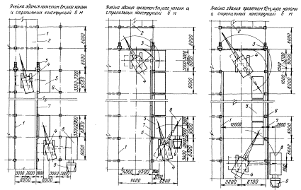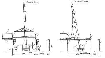 1 - балки чердачного перекрытия; 2 - плиты чердачного перекрытия; 3 - плиты покрытия; 4 - универсальная траверса; 5 - стропильная ферма; 6 - колонны; 7 - монтажный кран; 8 - лестница-площадка приставная; 9 - оттяжка Схемы укладки элементов чердачного перекрытия раздельным методом