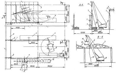 1 - временное ограждение; 2 - смонтированное покрытие; 3 - крышевой кондуктор-распорка для временного крепления ферм; 4 - приставная лестница-площадка; 5 - стропильная ферма; 6 - колонна; 7 - кран; 8 - штабель плит; 9 - транспортное средство; 10 - подстропильная ферма Схемы выгрузки, раскладки элементов и монтажа поперечным методом покрытия пролетом 18 м