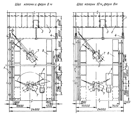 Примечание. В числителе приведены данные для ферм (балок), в знаменателе - для плит. Схемы выгрузки, раскладки элементов и монтажа продольным методом покрытия пролетами 6;9;12 м