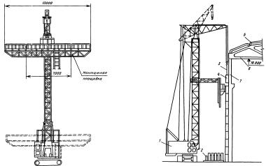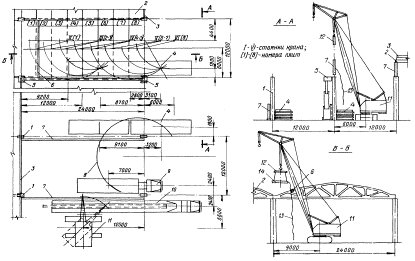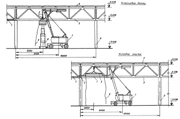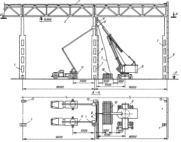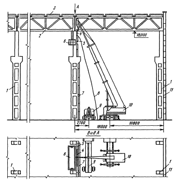 1 - колонны крайнего ряда; 2 - стойки фахверка; 3 - подкрановые балки; 4 - деревянные подкладки; 5 - автомобильный кран; 6 - транспортное средство; 7 - тормозная ферма; 8 - пояс тормозной фермы; 9 - колонны; 10 - строп; 11 - оттяжка
