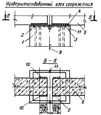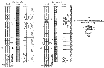 1 - оси ряда колонн; 2 - фермы; 3 - колонны; 4 - стойки фахверка; 5 - пояса тормозных ферм; 6 - подкрановые балки; 7 - съемные элементы; 8 - оси температурных швов; 9 - упорные коротыши; 10 - оси колонн Схемы и узлы крепления тормозных ферм подкрановых балок пролетом 12 м по средним рядам колонн