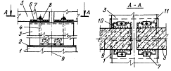 1 - колонна; 2 - закладная деталь колонны; 3 - стропильная ферма; 4 - приварные пластины-фиксаторы; 5 - закладная деталь стропильной конструкции; 6 - анкер закладной детали; 7 - разбивочная ось; 8 - монтажный шов; 9 - риска на оголовке колонны; 10 - скоба-фиксатор Универсальная траверса для монтажа стропильных конструкций и плит покрытия