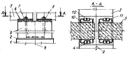 1 - колонна крайнего ряда; 2 - стойка фахверка; 3 - тормозная ферма; 4 - подкрановая балка; 5 - деревянные подкладки, 6 - автомобильный кран; 7 - балковоз Б-12; 8 - укрупненный блок крайнего ряда; 9 - траверса; 10 - укрупненный блок среднего ряда; 11 - колонны среднего ряда Схема установки укрупненных блоков подкрановых балок пролетом 12 м по колоннам среднего ряда