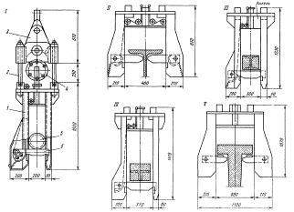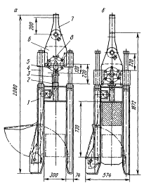 а - в раскрытом состоянии; б - в закрытом состоянии; 1 - П-образная рама; 2 - подставка; 3 - стойка; 4 - направляющая штанга; 5 - звездочка; 6 - головка; 7 - серьга; 8 - удлиненный стержень звездочки Автоматический захват. Общий вид. Типоразмеры