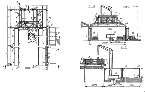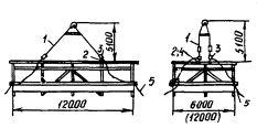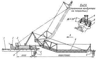 1 - рама; 2 - направляющая штанга; 3 - головка; 4 - звездочка; 5 - строительная конструкция; 6 - захватная балка Крышевой кондуктор-распорка Крышевой кондуктор-распорка, предназначен для временного крепления и приведения в проектное положение стропильных ферм при шаге 6 или 12 м. Он выполнен в виде стрелы (распорки) с захватом, шарнирно-соединенной с кареткой, установленной на ходовой тележке. Для закрепления кондуктора в рабочем положении тележка снабжена фиксирующими упорами и натяжным устройством, состоящим из ручной лебедки и двухветвевого стропа. Кондуктор имеет четыре электропривода, посредством которых осуществляется опускание и подъем стрелы, перемещение фиксирующих упоров, каретки со стрелой, кондуктора по плитам покрытия. Установка каретки на тележке возможна в трех положениях: по продольной оси тележки и с поперечным сдвигом вправо или влево на 700 мм. Конструкция кондуктора позволяет применять его на покрытиях при уклонах до 20°. При этом каретка со стрелой находится в горизонтальном положении. На покрытие первой смонтированной ячейки здания кондуктор-распорку поднимают краном и устанавливают так, чтобы реборды колес входили в зазоры между плитами. Закрепляют кондуктор в рабочем положении при помощи фиксирующих упоров и натяжного устройства. После установки стропильной фермы на колонны стрелу кондуктора опускают и она захватывает верхний пояс фермы. Проектное расстояние между осями верхних поясов монтируемой и ранее установленной ферм обеспечивается путем совмещения стрелы каретки с нулевой отметкой шкалы, прикрепленной к раме тележки кондуктора. С помощью крышевого кондуктора-распорки стропильные фермы монтируют на 20-30 мин быстрее. Соответственно снижаются время работы крана и затраты труда монтажников. Более надежно закрепляется верхний пояс фермы, повышается точность установки фермы, безопасность ее выверки и расстроповки. Техническая характеристика