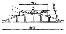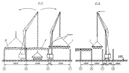 I, II, III - блоки покрытия Монтаж конструкций покрытия ведется краном СКГ-63 МОНТАЖ КРУПНОРАЗМЕРНЫХ ПЛИТ ПОКРЫТИЙ ДЛИНОЙ НА ПРОЛЕТТехнологическая схема разработана на монтаж железобетонных плит покрытий типа "П" с малым уклоном, разработанных ЦНИИпромзданий совместно с НИИЖБом для промышленных зданий высотой до 15 м. В состав работ, рассматриваемых схемой, входят: установка железобетонных балок; укладка железобетонных плит типа "П"; электросварка монтажных стыков; заливка швов раствором. Организация и технология строительного процесса До начала монтажа балок и плит покрытия должны быть: установлены колонны в соответствии с рабочими чертежами; смонтировано освещение всей территории строительной площадки, проездов и рабочих мест; подготовлены и размещены в зоне монтажа кран, инвентарь, приспособления, средства для безопасного ведения работ. Балки и плиты доставляют в горизонтальном положении поштучно на балковозах типа 2021 (конструкция ЦНИИОМТП) на базе КрАЗ-258. Доставленные на объект балки и плиты складируют в два яруса по высоте в зоне действия монтажного крана. Строповка и подъем плит покрытия производится при помощи траверсы грузоподъемностью 15 т конструкции ЦНИИпромзданий; балок - при помощи двухветвевого стропа грузоподъемностью 2,5 т. Монтаж балок и плит покрытия размером 18×3 м ведется краном РДК-25. Балки устанавливают в проектное положение, совмещая осевые риски на их торцах с рисками на опорных поверхностях колонн. Соединение балок с колоннами производится сваркой закладных элементов. Для производства монтажных работ и подъема рабочих к монтажным узлам применяются телескопические вышки высотой до 15 м. Крепление смонтированных конструкций производится с помощью электросварки закладных деталей плит или балок не менее чем в трех углах. Швы между плитами, предварительно очистив их от строительного мусора, заливают бетонной смесью. Работы по монтажу покрытий из сборных железобетонных балок и плит типа "П" размером 3×18 м выполняет бригада из 18 человек в две смены. В каждую смену работают звено № 1 из 7 человек и звено № 2 из 2 человек. Состав звена № 1: монтажник конструкций (звеньевой) - 1, монтажник конструкций 5 разряда - 1, монтажник конструкций 4 разряда - 1, монтажник конструкций 3 разряда (он же такелажник) - 1, монтажник конструкций 2 разряда (он же такелажник) - 1, электросварщик 5 разряда - 1, машинист крана 5 разряда - 1. Состав звена № 2: монтажник конструкций 4 разряда - 1, монтажник конструкций 3 разряда - 1. Операционный контроль качества работ по монтажу балок и плит покрытия типа "П" следует выполнять в соответствии с требованиями главы СНиПа III-16-80 и СН 47-74 (Инструкции по разработке ПОС и ПНР). Допускаемые отклонения от проектных величин при монтаже балок и плит покрытия, приведенные в главе СНиПа III-16-30, не должны превышать следующих значений:
