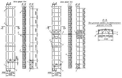 1 - вертикальные связи; 2 - фонарные фермы; 3 - оси стропильных форм; 4 - фонарные панели; 5 - торцевые панели; 6 - ось температурного шва; 7- монорельс; 8- верх стропильной фермы Схемы конструкций фонаря шириной 6 м (вид сверху)