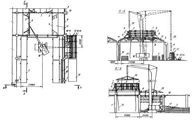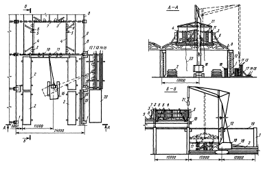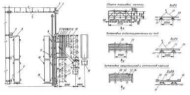 1 - колонны; 2 - штабеля плит покрытия; 3 - навесные лестницы; 4 - фонарные панели; 5 - лестницы; 6 - инвентарные подкосы; 7 - торцевая панель; 8 - люлька; 9 - ограждение; 10 - монтажные лестницы; 11 - плиты покрытия; 12 - вертикальные связи; 13 - монорельс; 14 - горизонтальные связи; 15 - кассета; 16 - монтажный кран; 17 - стропильная ферма; 18 - связь по колоннам; 19 - стенд для укрупнительной сборки; 20 - траверса; 21 - оттяжка Установка фонарной фермы