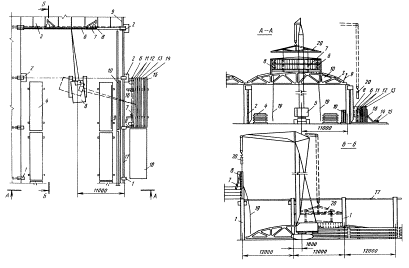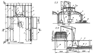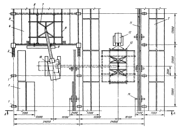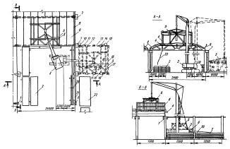 1 - колонны; 2 - штабеля плит покрытия; 3 - лестница; 4 - смонтированное покрытие; 5 - временное ограждение; 6 - смонтированный торцевой фонарь; 7 - траверса; 8 - рядовой фонарный блок; 9 - площадка навесная; 10 - гусеничный кран; 11 - место складирования стропильных ферм; 12 - трактор; 13 - сани с кондуктором; 14 - кассета Монтаж рядового фонарного блока. Разрез А-А
