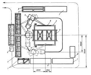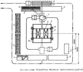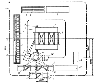 1 - временное ограждение; 2 - смонтированное покрытие; 3 - приставная лестница-площадка; 4 колонна; 7 - стропильная конструкция; 8 - плита покрытия; 9 - транспортное средство Схемы выгрузки, раскладки элементов и монтажа продольным методом покрытия пролетом 18 м