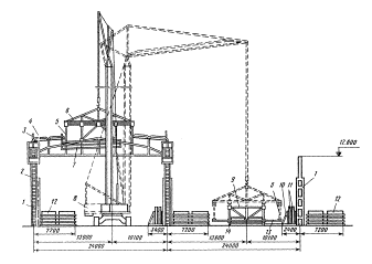 1 - временное ограждение; 2 - смонтированное покрытие; 3 - крышевой кондуктор-распорка; 4 - лестницы-площадки; 5 - стропильная ферма; 6 - колонна; 7 - кран; 8 - штабеля плит; 9 - транспортное средство; 10 - подстропильная ферма; 11 - траверса; 12 - оттяжки; 13 - монтируемая плита Схемы выгрузки, раскладки элементов и монтажа поперечным методом покрытия пролетом 24 м