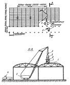 1 - колонны; 2 - приставная лестница; 3 - временное ограждение; 4 - смонтированное покрытие; 5 - рядовой фонарный блок; 6 - траверса; 7 - площадка навесная; 8 - гусеничный кран; 9 - инвентарная рама; 10 - кассета; 11 - стропильные фермы; 12 - штабеля плит покрытия; 13 - кондуктор для укрупнительной сборки фонарей блоками; 14 - сани МОНТАЖ ПРОФИЛИРОВАННОГО СТАЛЬНОГО НАСТИЛА ПОКРЫТИЯСхема разработана на укрупнительную сборку и монтаж картин профилированного стального настила марки Н 60-782-0,8 с использованием машины для автоматического сверления отверстий (проект 1698.00.000 ЦЭКБстроймехавтоматика ЦНИИОМТП). Укрупнительную сборку настила в картины предусмотрено выполнять на сборочной площадке, расположенной в зоне действия монтажного крана, предназначенного для установки картин на предварительно укрупненный блок покрытия или в проектное положение. Укрупненные картины могут быть двух размеров - 6×12 и 5,5×12 м (их укладывают у температурного шва). До начала укрупнительной сборки картин профилированного стального настила должна быть подготовлена сборочная площадка, установлены и выверены стенды, доставлены необходимые монтажные приспособления. Для обеспечения поточности работ укрупнительную сборку предусмотрено выполнять на двух стендах. Профилированный настил складируют пакетами на площадках около стендов. Укладкой листов настила с подгонкой на стенде занимаются три монтажника 2 разряда. До начала сверления отверстий под комбинированные заклепки сверлильная машина должна быть подключена к электросети напряжением 330 В, а в конце стыка соединяемых листов должен быть установлен инвентарный упор, обеспечивающий автоматическое отключение механизма передвижения. Машину для сверления отверстий размещают на профилированном настиле так, чтобы ведущие колеса находились впереди и в соседних гофрах от стыка, а ведомое колесо - в стыке листов. Для сверления отверстий монтажник должен сначала включить два автоматических включателя защитного устройства, затем подать напряжение к машине, нажав кнопку "включено", расположенную на дверце электрошкафа в задней части машины, переключить тумблер режима работы на "автомат" и нажать кнопку "пуск" привода машины на пульте управления. В процессе перемещения машины по стыку и сверления отверстий, монтажник устанавливает комбинированные заклепки. После автоматической остановки машины в конце стыка, монтажники должны переставить ее к следующему стыку, развернув на 180°. В схеме предусмотрено применение двух машин для сверления отверстий на одном стенде. В этом случае сокращаются сроки монтажа, и обеспечивается максимальная загрузка машин. До начала монтажа картин профилированного настила в зону работы крана должен быть доставлен кондуктор-тележка с укрупненным каркасом блока покрытия. Установку картин профилированного настила производят тем же монтажным краном, которым выполнялось укрупнение каркаса блока покрытия. После установки картины на блок ее крепят к прогонам при помощи самонарезающих винтов или дюбелей. При монтаже картин профилированного настила следует руководствоваться указаниями главы СНиПа III-18-75 "Металлические конструкции. Правила изготовления, монтажа, приемки" и главы СНиПа III-4-80 "Техника безопасности в строительстве".