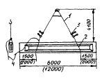 1 - колонны; 2 - стропильная ферма; 3 - плита покрытия; 4 - траверса; 5 - панель перегородки; 6 - перегородка; 7 - оттяжка; 8 - монтажный кран; 9 - наружное стеновое ограждение; 10 - кассета с панелями; 11 - монтажный подъемник; 12 - колонны фахверка МОНТАЖ ПОДВЕСНЫХ ПОТОЛКОВДаны схемы монтажа сборных железобетонных конструкций подвесного потолка (чердачного перекрытия) одноэтажных промышленных зданий совмещенным и раздельным методами. Схемы разработаны для одноэтажного промышленного здания с плоской кровлей. Сетка колони 12×18 м. Высота до низа ферм покрытия 6 м. На этой же отметке располагается подвесной потолок из сборных железобетонных конструкций серии 4-959-65 "Конструкции типовой секции бесфонарных зданий с сеткой колонн 12×18 м для предприятий текстильной промышленности". Рассматриваемая конструкция подвесного потолка нашла широкое применение при строительстве зданий для текстильной промышленности. Совмещенный метод монтажа предусматривает установку одним кранов в одном потоке пяти различных конструктивных элементов: стропильных ферм, подвесных опор, балок и плит чердачного перекрытия, плит покрытия. Для совмещенного метода монтажа разработана универсальная траверса, с помощью которой можно устанавливать все указанные конструктивные элементы. Грузоподъемность траверсы от 2,5 до 20 т (2,5 т - для плит подвесного потолка, 6,3 т - для балки подвесного потолка, 8 т - для плит покрытия и 20 т - для ферм). Схема строповки приведена на чертеже. Высота строповки элементов подвесного потолка и покрытия определена из расчета их установки гусеничным краном РДК-25 со стрелой длиной 22,5 м. Ниже рассмотрены два варианта совмещенного монтажа конструкций: при движении монтажного крана поперек и вдоль пролетов. Для выполнения работ по первому варианту рекомендуется кран РДК-25 грузоподъемностью 25 т, по второму - СКГ-63А грузоподъемностью 63 т. Монтаж подвесного потолка раздельным методом осуществляют после сборки каркаса здания или его части. Это вызвано, во-первых, тем, что в некоторых проектных решениях предусмотрено крепление элементов подвесных потолков к уже смонтированным конструкциям покрытия (фермам, плитам). Во-вторых, для установки относительно легких элементов подвесного потолка (до 5 т) неэффективно использовать тяжелые краны, применяемые при установке элементов каркаса массой до 20 т. Для монтажа элементов подвесного потолка раздельным методом внутри здания рекомендуется кран К-161, оснащенный телескопическим башенно-стреловым оборудованием. Геодезический контроль и обеспечение точности монтажа подвесных потолков Необходимо проверять точность размеров балок подвесного потолка и плит перекрытия, доставляемых на строительную площадку при помощи стальной компарированной рулетки. Погрешность контрольных измерений не должна превышать 10 % допускаемого отклонения по контролируемому параметру. При монтаже необходимо контролировать: отклонение расстояний между осями балок перекрытия на уровне верхнего пояса; смещение осей балок по нижнему поясу относительно геометрических осей опорных конструкций; разность отметок лицевых поверхностей двух смежных плит перекрытия в стыке; смещение в плане плит перекрытия относительно их проектного положения на опорных поверхностях. Расстояние между осями балок перекрытия проверяют рулеткой с двукратн