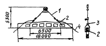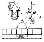 1 - плиты покрытия; 2 - балки покрытия; 3 - колонны; 4 - траверса грузоподъемностью 15 т; 5 - кран; 6 - двухветвевой строп грузоподъемностью 2,5 т Детали крепления балок и плит покрытия