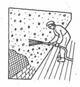 на высоте Перед работой штукатур-оператор осматривает все поверхности, подлежащие оштукатуриванию, определяет качество их подготовки. Для нанесения слоя грунта применяется форсунка. Карта рекомендует бескомпрессорную форсунку, которая распыляет раствор без применения сжатого воздуха. Воздушная трубка должна крепиться подвижно; она удобна тем, что, удаляя или подвигая ее к наконечнику форсунки, можно увеличивать или уменьшать факел распыла раствора. До каждого штукатура-оператора должны быть доведены технические условия приемки данной работы согласно СНиП III-В.13-62 §§ 2.16; 2.20; 2.21. Все остальные условия и подготовка процесса идентичны с картой КТ (на процесс обрызга поверхности кирпичных стен). Для снижения утомляемости в работе должно быть использовано время на отдых, включенное в норму времени в размере, предусмотренном нормативами, указанными, в «Основах методики технического нормирования труда» /НИИЭС Госстроя СССР, выпуск I 1967 года/. ТЕХНИКА БЕЗОПАСНОСТИ При производстве работ по нанесению грунта при оштукатуривании внутренних кирпичных стен необходимо руководствоваться нормами и правилами по технике безопасности, изложенными в СНиП III-А.II-62 §§ 17.1; 17.5-17.14; 17.9 и противопожарными мероприятиями. IV ТЕХНОЛОГИЯ И ОРГАНИЗАЦИЯ ПРОЦЕССАПри нанесении слоя грунта на оштукатуриваемые поверхности соблюдается следующая последовательность в работе. Подготовляется рабочее место: устанавливается столик-подмости, подается раствор растворонасосом и проверяется действие форсунки. Первый слой штукатурного на мета, называемый обрызгом, через 2-6 часов посла его нанесения смачивается водой. Через 15-20 минут посла этого по сигналу штукатура-оператора моторист включает растворонасос и штукатур-оператор с помощником при помощи форсунки наносит слой грунта. Во время работы растворонасоса помощник штукатура-оператора следит за шлангом, предотвращай его от перегибов, переломов и скручивания (во избежание образования пробок), а также переносит его по мере передвижения штукатура-оператора. ГРАФИК ТРУДОВОГО ПРОЦЕССА