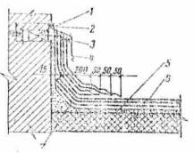 1 - деревянная пробка; 2 - цементный раствор; 3 - гвозди; 4 - кровельная сталь; 5 - стяжка; 6 - слой утеплителя; 7 - слой рулонного материала.