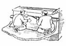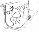 К-2 руками приглаживает полотнище вдоль, К-1 идет следом за ним и приглаживает полотнище поперек, добиваясь плотного его прилегания к основанию. После приклейки К-1 и К-2 прибивают гвоздями верх полотнища к рейке |