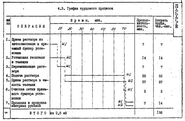 4.4. Описание операций, их продолжительность, исполнители, орудия труда. 1. Прием раствора из автосамосвала в приемный бункер установкиШтукатур Ш1 подает сигналы водителю автосамосвала на подъезд и остановку, следит за выгрузкой раствора из кузова автосамосвала в приемный бункер установки, окончив приемку, скребком очищает кузов от остатков раствора. Операция выполняется 7 мин. 2. Установка гасителя и тележкиШтукатур Ш2 на отметке устанавливает гаситель и подводит под него тележку. Операция выполняется 14 мин; 3. Перемешивание раствораПосле приема раствора штукатур Ш1 следит за перемешиванием раствора. При необходимости с помощью насоса добавляет воду. Операция выполняется 7 мин. 4. Подача раствораШтукатур Ш2 подает сигналы через штукатура Ш1 машинистам установки и компрессора на готовность приема раствора. Штукатур Ш1 следит за подачей раствора на отметку и наблюдает за напорными рукавами. Операция выполняется 55 мин. 5. Прием раствора в емкость тележкиШтукатур Ш2 следит за тем, чтобы раствор из гасителя падал точно в емкость тележки. После ее заполнения рабочие обслуживаемой бригады выкатывают тележку и штукатур Ш2 заменяет ее на порожнюю. Операция выполняется 57 мин. 6. Очистка сетки приемного бункераШтукатур Ш1 удаляет с сетки приемного бункера установки частицы наполнителя крупнее 10 мм и другие отходы. Операция выполняется 2 мин. 7. Промывка и продувка напорных рукавовПосле окончания подачи раствора штукатур Ш1 при помощи воды и воздуха промывает и продувает напорные рукава, а штукатур Ш2 принимает воду после промывки рукавов в специальную емкость. Операция выполняется 7 мин. Норма времени Нвр. На подачу 1 м3 раствора 156 : 2,5 = 62,4 чел.-мин.