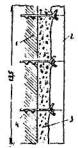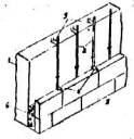 Рис.8 Крепление облицовки при помощи каркаса а - общий вид; б - деталь крепления облицовочных плит к каркасу 1 - колонна; 2 - вертикальные прутья каркаса; 3 - облицовка; 4 - горизонтальная обвязка; 5 - облицовка; 6 - раствор. 4.2.8. Тонкие плиты Тонкие пииты толщиной 2,5 см, высотой до 60 см часто временно зацепляют деревянными клиньями. Верхние кромки устанавливаемого ряда облицовки зажимают деревянными клиньями - пробками, закладывают в гнезда постоянных креплений, которые устанавливают одновременно. После заливки раствором пространства между стеной и облицовкой пробки вынимают.