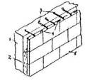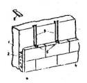 Рис.4 Крепление облицовки по готовой стене 1 - стена; 2 - вертикальные прутья; 3 - хомуты; 4 - скобы; 5 - облицовка; 6 - раствор. 4.2.4. Одновременно с кладкой Облицовку выполняют одновременно с кладкой. Плиты соединяют между штырьками с пластинками, а в верхние края облицовки для крепления к стене заделывают металлические скобы диаметром 6-12 мм. Количество их на элемент облицовки зависит от размеров последнего.