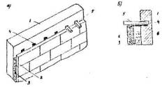 Рис.9 Крепление тонких облицовочных плит а - общий вид крепления; б - деталь крепления 1 - стена; 2 - облицовка; 3 - раствор; 4 - гнезда; 5 - деревянные клинья; 6 - металлические крепления. 4.2.9. На относе