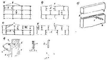 Рис. 10. Крепление плит на относе а - расположение закреп при облицовке «шов в шов»; б - расположение закреп при облицовке вразбежку (h - менее 500 мм; l - менее 1000 мм); в - расположение закреп при облицовке «шов в шов» (h = более 500 мм; l = до 1000 мм); г - расположение закреп при облицовке вразбежку (h - более 500 мм; l - более 1000 мм); д - деталь крепления карниза; е - деталь крепления карниза; 1 - закрепы; 2 - ключ; 3 - карниз; 4 - уголок; 5 - гнездо; 6 - облицовка; 7 - крепящий болт; 8 - пазы В этом случае облицовку устанавливают без заливки раствором и крепят к стене при помощи специальных пластинчатых закреп. Ориентировочное количество закреп на 1 м2 облицовки зависит от расстояния относа облицовки. Величина относа в мм . . . . . . . . . . . . . . . . . . . . . . . . . . . . . . . . 30 40 50 Минимальное количество закреп на 1 м2 облицовки . . . . . . . 4 5 6 Длина закрепы 100 мм, длина пластинки 70 мм, а ее высота 10 мм. Закрепа имеет раздвоенный конец с зубками. После того, как конец закрепы будет вставлен в звено, в нее помещают вкладыш, который поворачивают в закрепе при помощи специального ключа, раздвигая тем самым конец закрепы до стенок гнезда. Длина гнезда в стене 60-100 мм, диаметр 22-27 мм. Для пластинки закрепы в мраморных плитах при помощи карборуднового диска выбирает паз глубиной не менее 5 мм. В белых мраморных плитах его делает на всю длину плиты; в цветных плитах паз выполняют только в прочных нетрещиноватых ее участках. Закрепа входит своей горизонтальной пластинкой наполовину в верхнюю и нижнюю плиты. В вертикальных швах закрепы устанавливают на расстоянии 50 мм от края плиты. После установки плиты гнезда в стене и паз в плите заполняют раствором густой консистенции на расширяющемся цементе при помощи шпателя или скарпели. Гнездо заполняют раствором в два-три приема, причем первую порцию раствора вносят вместе с закрепой. При выполнении работ необходимо следить, чтобы раствор не попадал на лицевую поверхность облицовки.